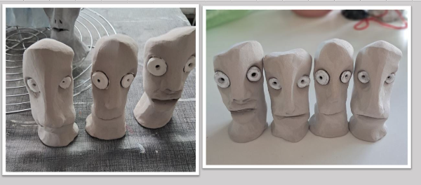 Dus dat was wat ik verwacht had, dan zou het wit, en in dit geval hun ogen nog een stuk beter uitkomen. Ik heb mij aan de voorgeschreven temperatuur voor het glazuur gehouden, maar ik ga ze wel nog eens bakken tot 1200° om ze donkerder te krijgen. Dan kan ik ook zien wat er met het glazuur gebeurd op die temperatuur... Keramiek, het is één groot experiment zou Ann zeggen. En ook in deze licht grijze toestand geven ze stof af, maar dat lijkt wel te stoppen eens als ze afgestoft zijn...