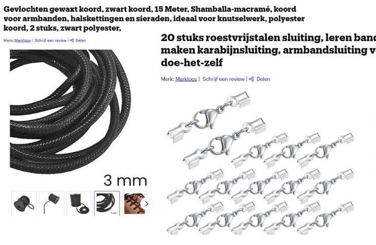 Na wat zoeken op dezelfde site vind ik de 2 dingen die ik zoek. Een lekkere dikke koord van 3 mm, ideaal voor mijn creaties. Daar kan alles lekker stevig aan hangen. En ik bestel ook een pak van 20 sluitingen. Volgens de foto's hebben die een opening van 3 mm die je dan met een tang moet toepitsen. Dus dat moet lukken denk je dan 😅.