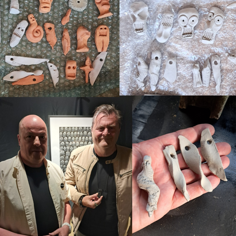 Dat gaf dus een zeer stuntelig schouwspel toen collega kunstenaar Frans Vogels (foto) erop stond om een zwarte "doodskop" hanger van mij over te nemen 😁. Je ziet de verslagenheid op mijn gezicht, maar ik was toch blij dat ik het voor hem had in elkaar gekregen. Later die avond zou ik het schouwspel nog eens overdoen voor een verzamelaarster van mijn werk, maar dan wel al iets vlotter. Dus er is een noodzaak. Ik maak graag mooie hangers, maar ik wil dan ook wel een degelijke drager aanbieden. Iets kwalitatief waar mijn creatie kan aanhangen. Geen Temu of andere shit... dus... Bol punt com.