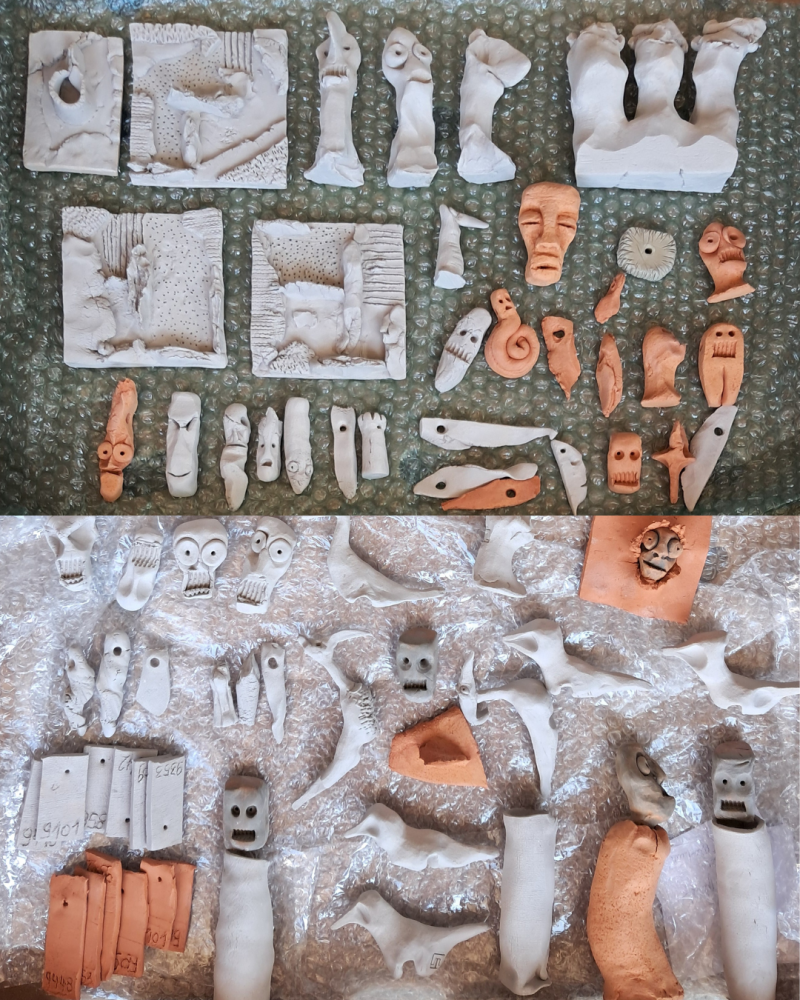 Er zitten ook al vogels tussen de stukken. Ik heb 2 versies gemaakt in de grijze klei. Ik heb nog geen idee hoe ik ze wil afwerken. Glazuur of geen glazuur, that's the question...