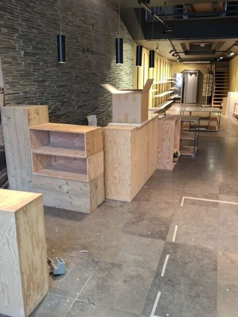 Gelukkig werd deze winkelinrichting nog weggehaald door de mensen van de stad. De voorzichtigheid naar de muren toe was niet meer nodig 😉. Er wordt op voorhand steeds een plan opgemaakt dat zo goed mogelijk rekening houdt met ieders wensen. Zodat we allen tevreden zijn met de opstelling.