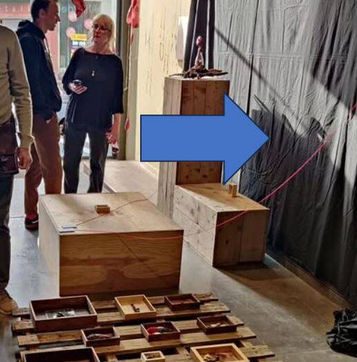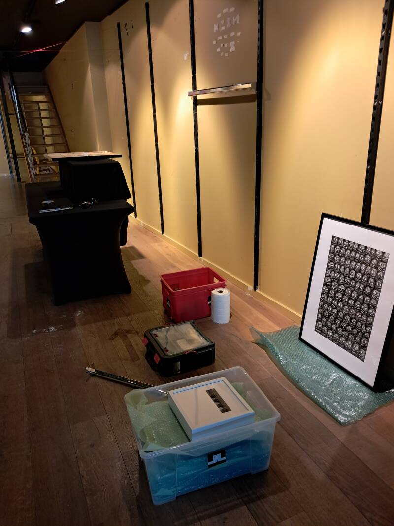 Dus wij verstoppen het achter een groot zwart doek. Gelukkig ben ik diegene die altijd een doek van zulke omvang bij heeft, want als je regelmatig hier en daar eens op een kunstmarkt staat, verzamel je door de jaren heen wel een stevig arsenaal aan opbouwmateriaal. Ik kreeg van Ann enkele zwarte doeken om achter mijn werken te hangen en de ombouw kon beginnen. Ik neem altijd al mijn opbouwmateriaal mee zodat ik steeds ter plekke kan improviseren en mijn "stand" kan opbouwen op de beste manier. Ook nu kon ik gebruikmakende van de bestaande zwarte rails, redelijk snel en zonder extra boren of haken plakken een mooie presentatie opbouwen.