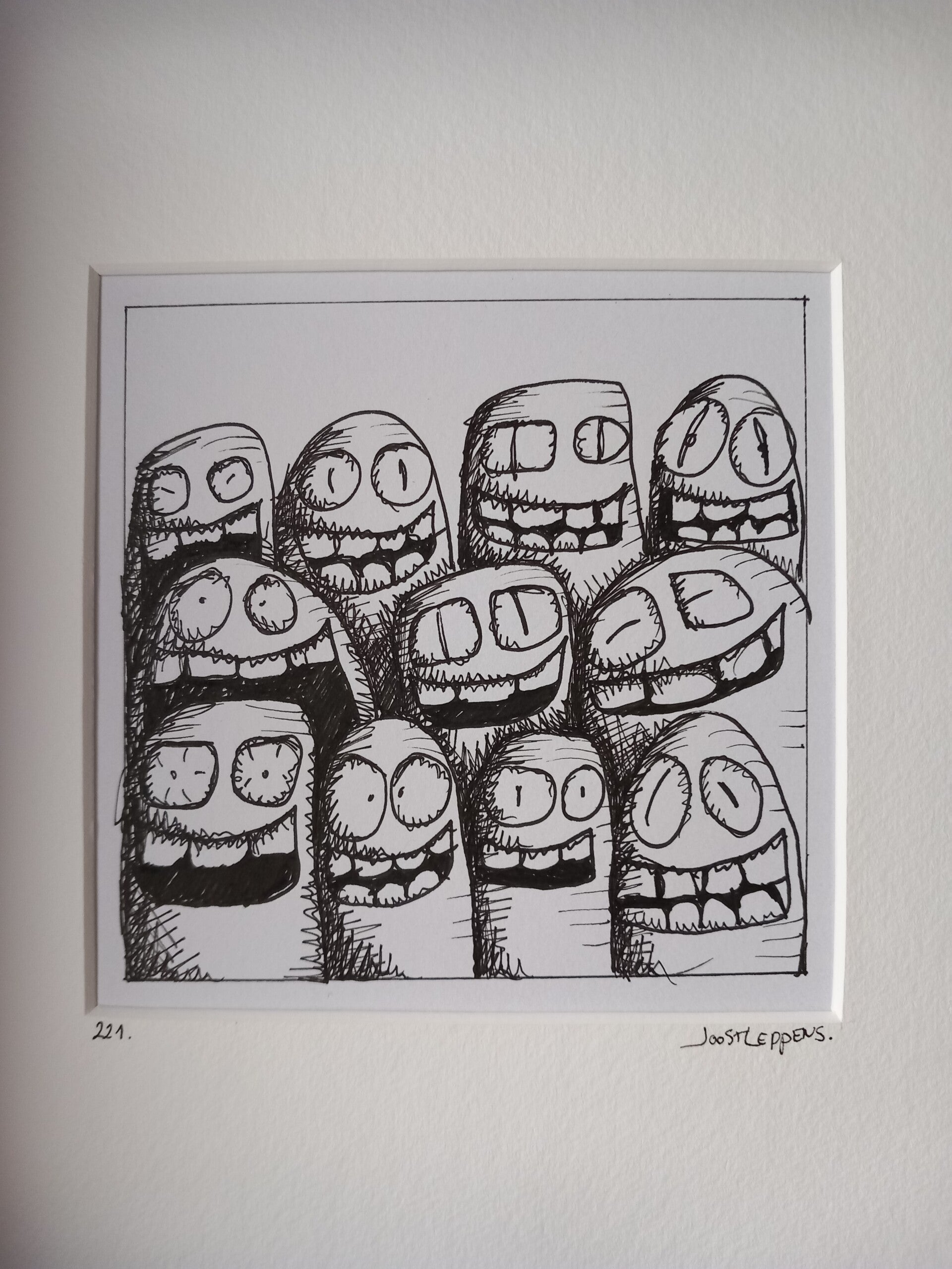 Deze tekening is een terugkeer naar mijn oorspronkelijke stijl, een speelse verzameling van monstertjes die je allemaal met een glimlach aankijken. Het zijn als het ware je eigen "hangmonstertjes", klaar om je dagelijks te begroeten of je bezoekers even te laten lachen van verbazing.